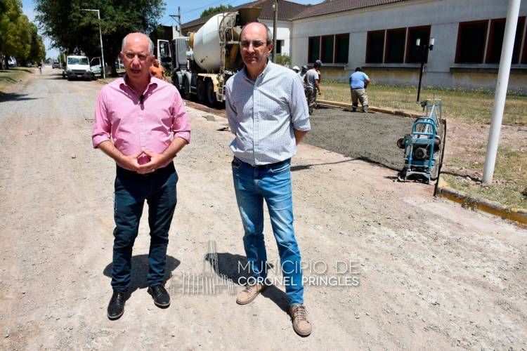 En la jornada de ayer las tareas se desarrollaron en la colectora y calle 60, frente a la Escuela N°7, donde se avanza con el hormigonado del estacionamiento como paso previo a la continuidad de la obra.