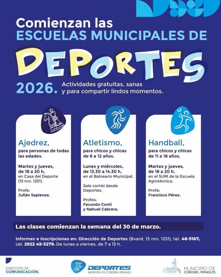 Para consultas e informes, dirigirse a Dirección de Deportes, Boulevard 13 1251, lunes a viernes de 7 a 13 horas, teléfono 46 5167, celular 2922 45 3279.