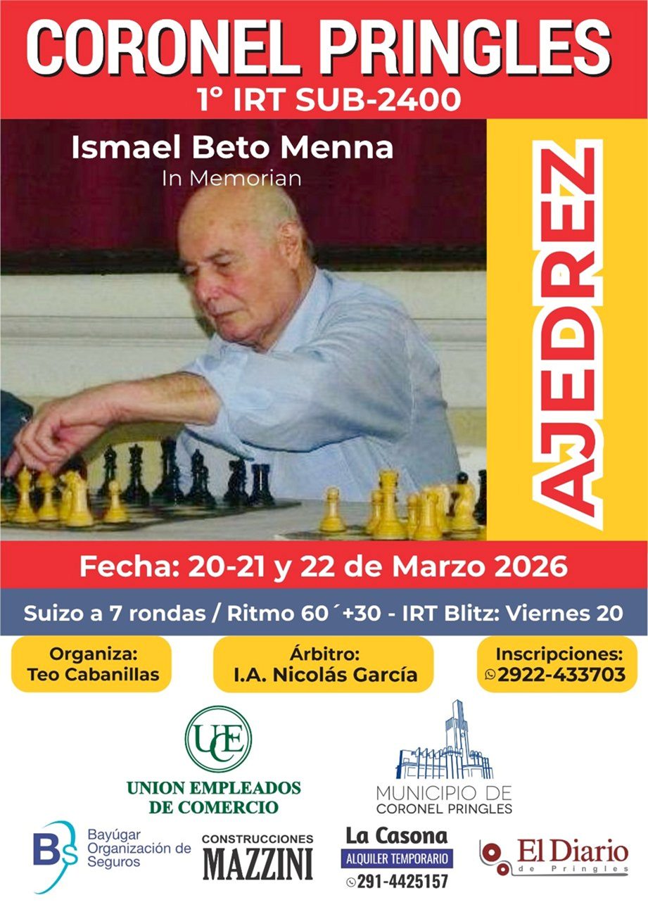 Nos pone realmente muy contentos ver cómo se va armando este torneo, con cada vez más gente que se acerca y se suma a esta propuesta en Coronel Pringles, que da un paso importante organizando su primer IRT, nada menos que en homenaje a Ismael Beto Menna. 20, 21 y 22 de marzo 2026 Todavía estás a tiempo de anotarte y ser parte Cobertura: MI Benjamín Mela Bajo la organización de: Teo Cabanillas Árbitro: I.A. Nicolás García PREPARATE PARA VIVIR EL MINUTO A MINUTO DE LA COBERTURA Los esperamos para vivir un fin de semana a puro ajedrez, competencia y camaradería