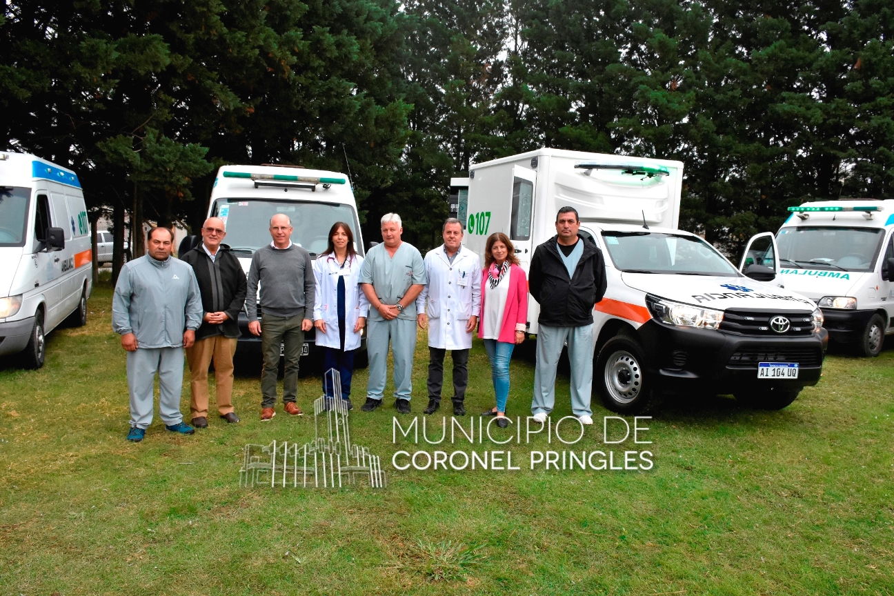 Acompañaron la presentación de los nuevos equipos Carina Scaglia (Directora de Salud), Zulma Campbell (Administradora del Hospital), Belén Nebbietti (Contadora del Municipio) y los choferes de las ambulancias Diego Pérez, Guido Haderne y Héctor Quiroga.