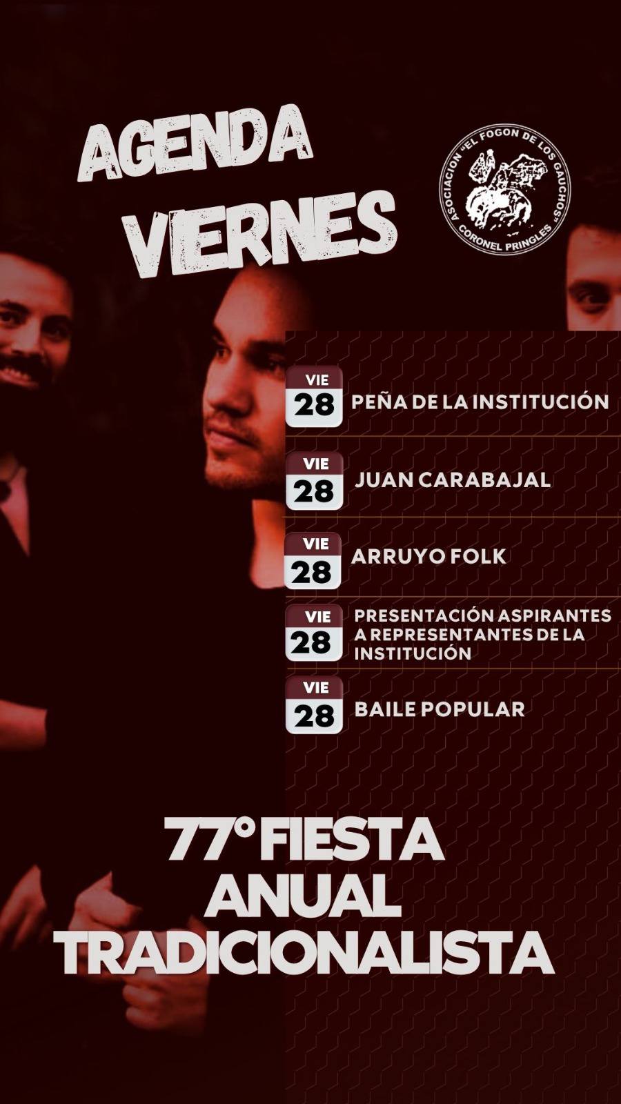 - ANECDOTARIO DE EL FOGON - PRESENTACION DE ASPIRANTES A REPRESENTANTES DE LA INSTITUCION 2026 - ACTUACION DEL CUERPO DE BAILE DE LA INSTITUCION VIERNES 28/11 (a partir de 21 hs) - ACTUACIÓN DE ESCUELA DE DANZAS Y BALLET DE LA INSTITUCIÓN - ACTUACION DE JUAN CARABAJAL - PRESENTACIÓN DE ASPIRANTES A REPRESENTAR LA INSTITUCIÓN EN EL AÑO 2026 - ACTUACIÓN DE ARRUYO FOLK - PARA FINALIZAR: BAILE - Servicio de cantina (Entrada gratis – no se permite ingresar con heladeras/conservadoras)