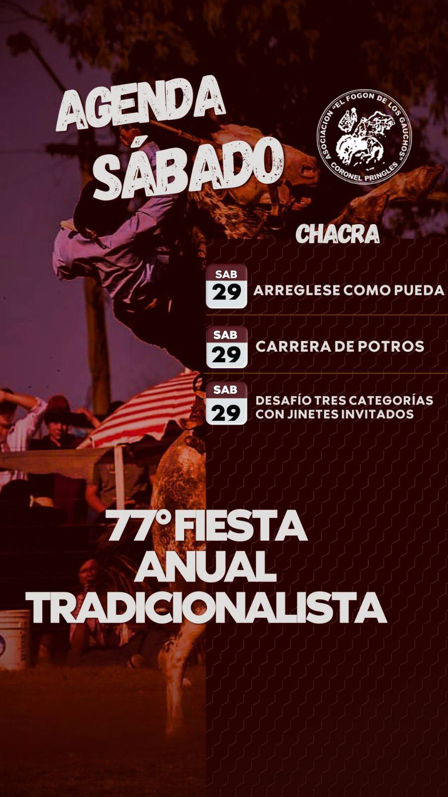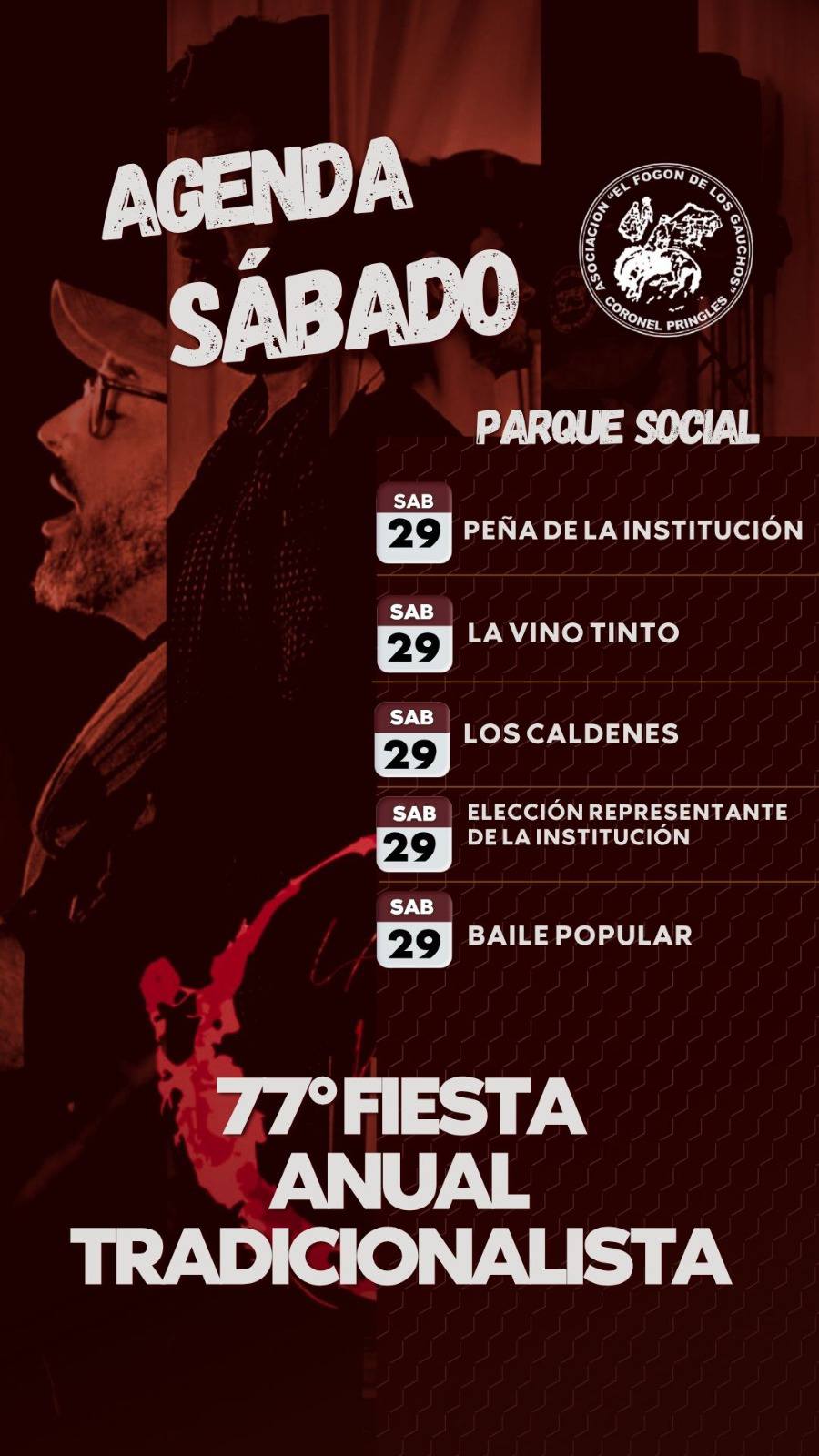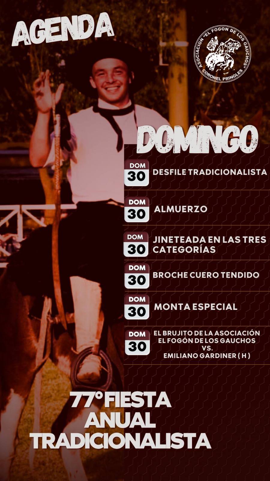 SABADO 29/11 (a partir de 14:30 hs) - - - ARREGLESE COMO PUEDA CARRERA DE POTROS DESAFIO 3 CATEGORIAS (TODAS LAS ACTIVIDADES CON JINETES INVITADOS) ANIMACIÓN: NACHO BASTEIRO Y MARTIN OVIEDO PAYADOR: FACUNDO QUIROGA Entrada: $ 15.000.- SABADO 29/11 (a partir de 21 hs) - - ACTUACION DE ESCUELA DE DANZAS Y BALLET DE LA INSTITUCIÓN ACTUACIÓN DE LA VINO TINTO - - - - ELECCIÓN DE REPRESENTANTES DE LA INSTITUCIÓN PARA EL AÑO 2026 ACTUACIÓN DE LOS CALDENES PARA FINALIZAR: BAILE CON LOS SAPOS DE JUAN Servicio de cantina Entrada: $ 8.000.- (no se permite ingresar con heladera/conservadora) DOMINGO 30/11 - - 10 hs PASEO GAUCHO 13 hs ALMUERZO PARA LAS DELEGACIONES Y PUBLICO 14:30 hs: - JINETEADA CLINA, GURUPA Y BASTOS Segunda SEMIFINAL CLASIFICATORIA PARA JESUS MARIA - MONTA ESPECIAL: EL BRUJITO CON EMILIANO GARDINER (H) ANIMACIÓN: NACHO BASTEIRO Y MARTIN OVIEDO PAYADOR: FACUNDO QUIROGA CABALLADA: de nuestra institución reforzada con: - - LA ANDARIEGA (de Tolosa Hnos) LA YUNTA (de Roberto Leoz y flia) APADRINADORES: - - - - Mauro Tolosa Chuli Ugarte Pancho Etchemendi Chacho Garcia Entrada: $ 30.000.-