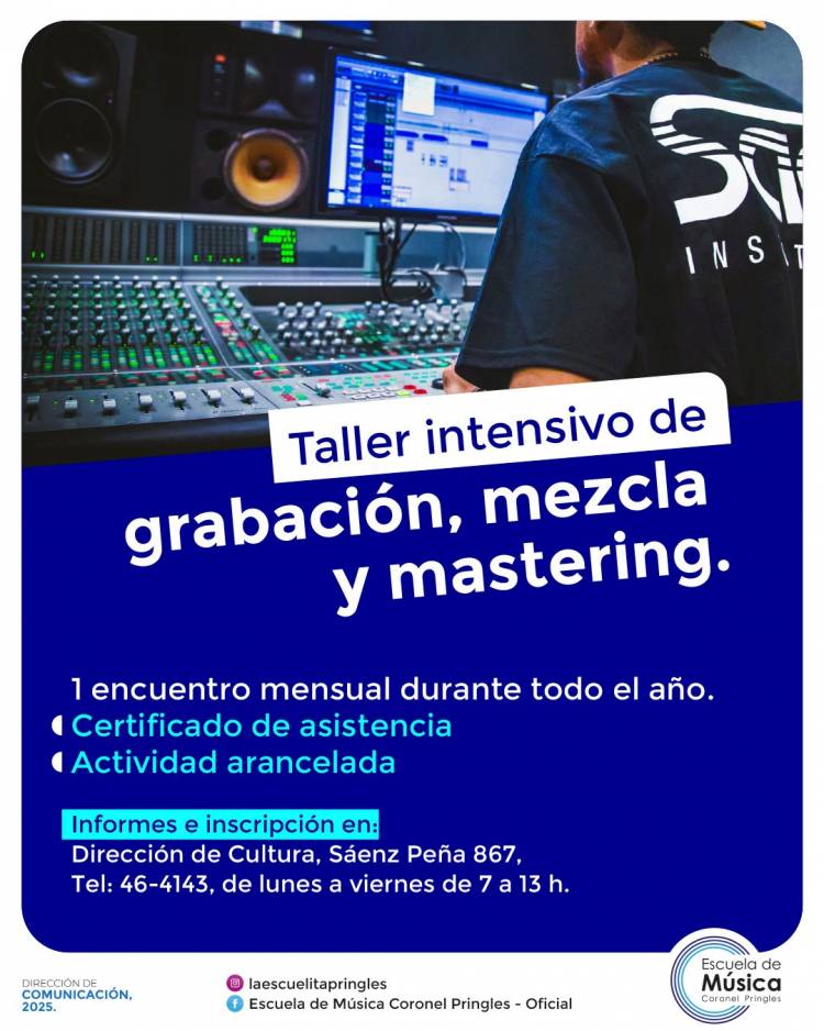 La propuesta es "un taller intensivo de grabación, mezcla y mastering que se dictará en la Escuela Municipal de Música a cargo de profesionales en la materia", expresó Cavallaro y que "en Pringles no se ha hecho hasta el momento, enfocado a todas aquellas personas que están haciendo música y quieren empezar a grabar", agregó Orbe.