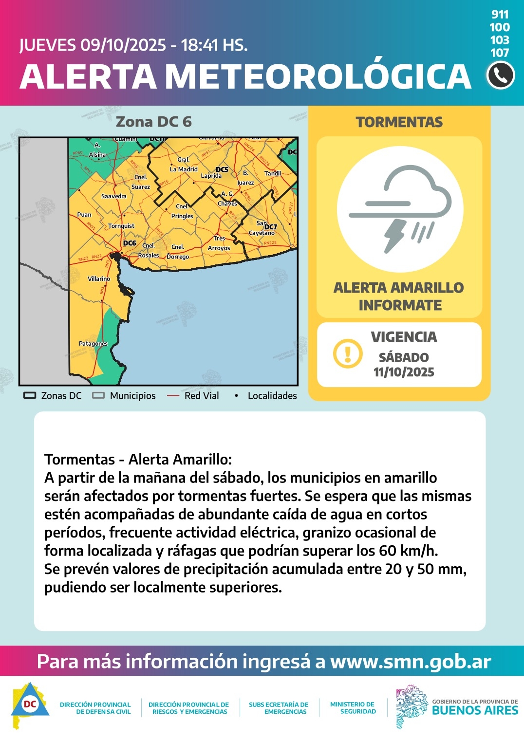 El Servicio Meteorológico Nacional emitió un alerta para este sábado 11 de octubre.